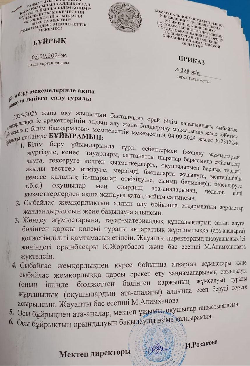 Жалпы ақша жинамау туралы бұйрық » К.Ушинский атындағы №7 орта мектеп. Талдықорған