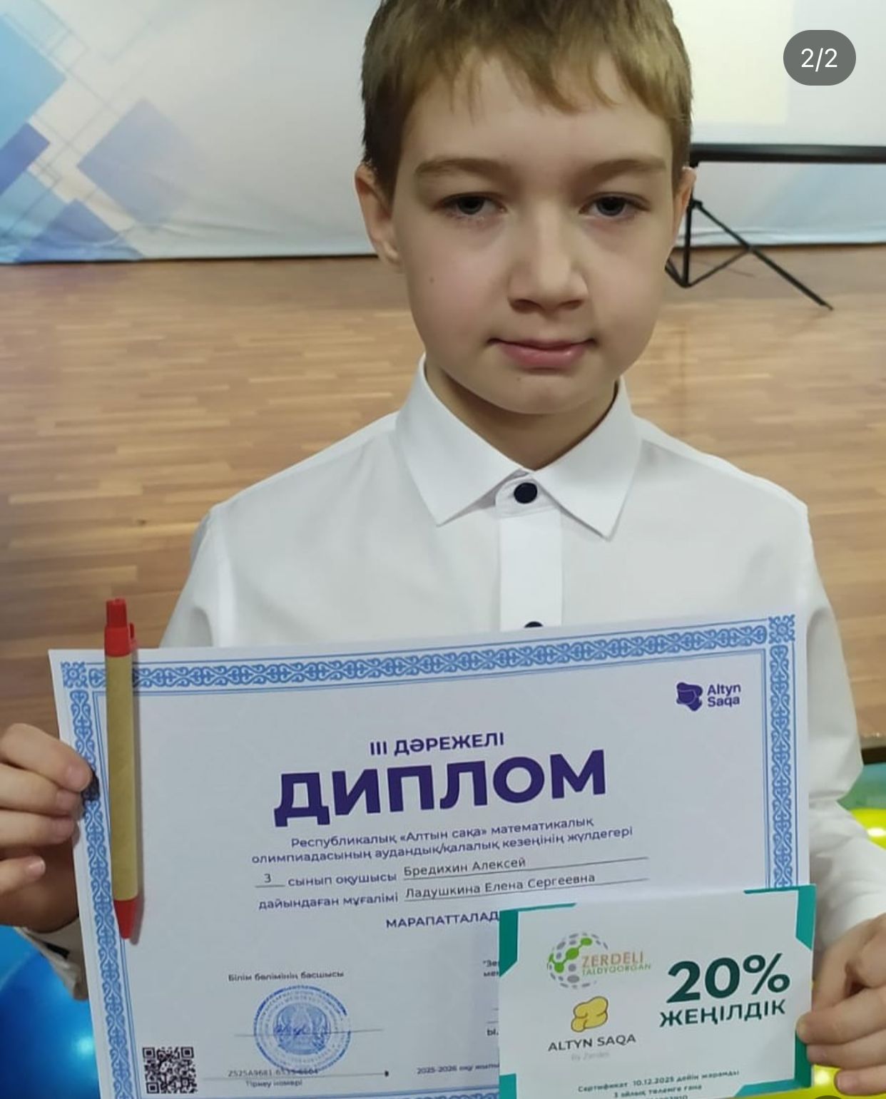 Ученик 4 «В» и 3”В” класса КГУ « Средней школы №7 им. К. Ушинского города Талдыкорган» занял в городской Олимпиаде « Алтын Сака по математике 📚Сейтқазы Дарын - 2 место