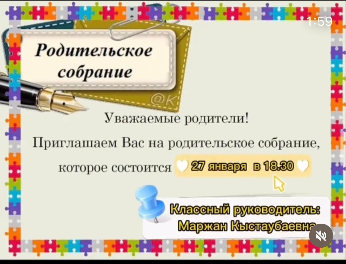 28 январь 2023 0 1 2 3 4 5 Родительское собрание в новом формате . Классный руководитель: Ражимова Маржан Кыстаубаевна , 4 «В»класс. Родительское собрание в новом формате . Классный руководитель: Ражимова Маржан Кыстаубаевна , 4 «В»класс.