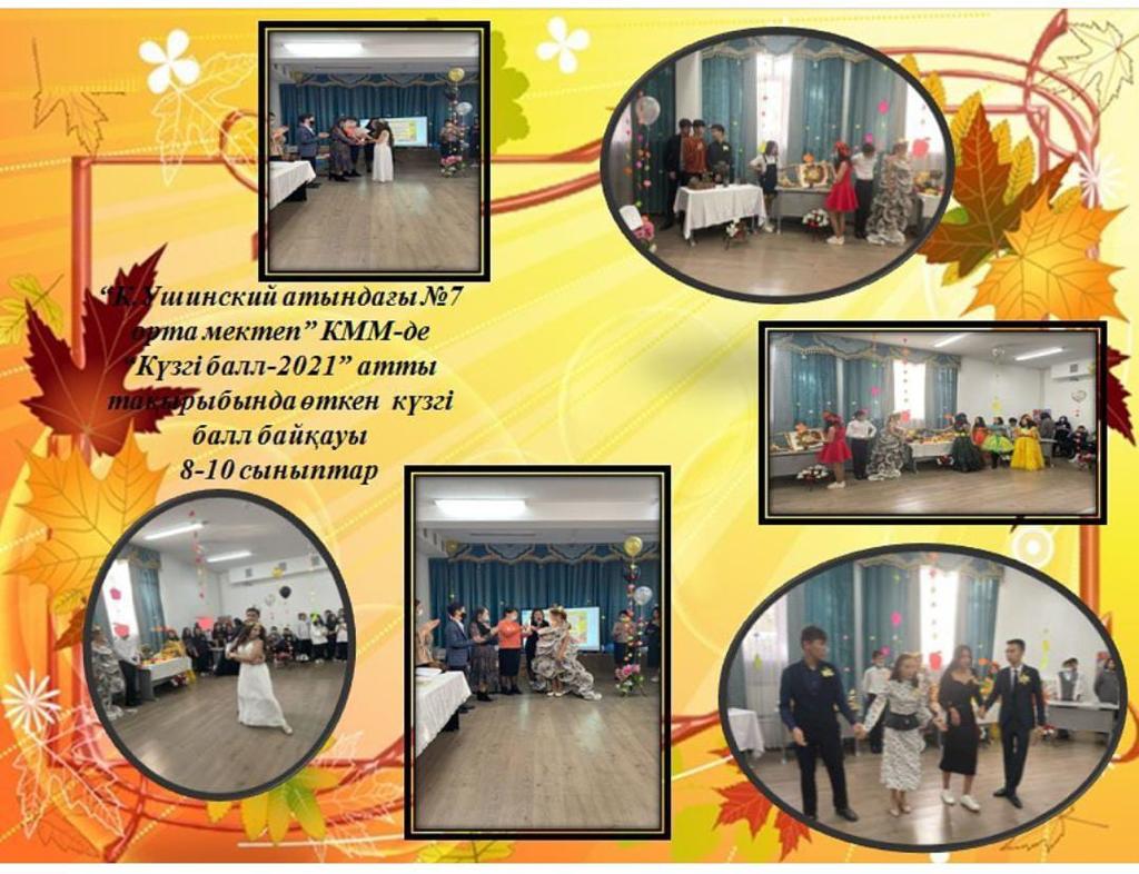 Күз - Жыл мезгілдерінің ішіндегі ең бір адамзат баласына көтеріңкі көңіл-күй мен тамаша әсер сыйлайтын ғажайып шақ. Осыған орай, сары желекке оранған Алтын күздің қақ ортасы қазан айының 18-20 аралығында «Алматы облысы білім басқармасының Талдықорған қаласы бойынша білім бөлімі» ММ «К.Ушинский атындағы №7 орта мектеп» КММ-де дәстүрлі «Күзгі балл-2021» атты 8-10 сыныптар арасында байқау өтті. Байқау бірнеше кезең бойынша жүзеге асты. Сайысқа қатысқан оқушылар әр түрлі заттардан бұйымдар жасап, киім тігу коллекциясында он саусағынан өнер тамған шебер екендіктерін көрсетіп, әділ қазылар алқасының таңдайын қақтырды. Осындай керемет байқауда мектебіміздің игі әділ қазы алқалары да өздерінің әділ бағаларын берді.