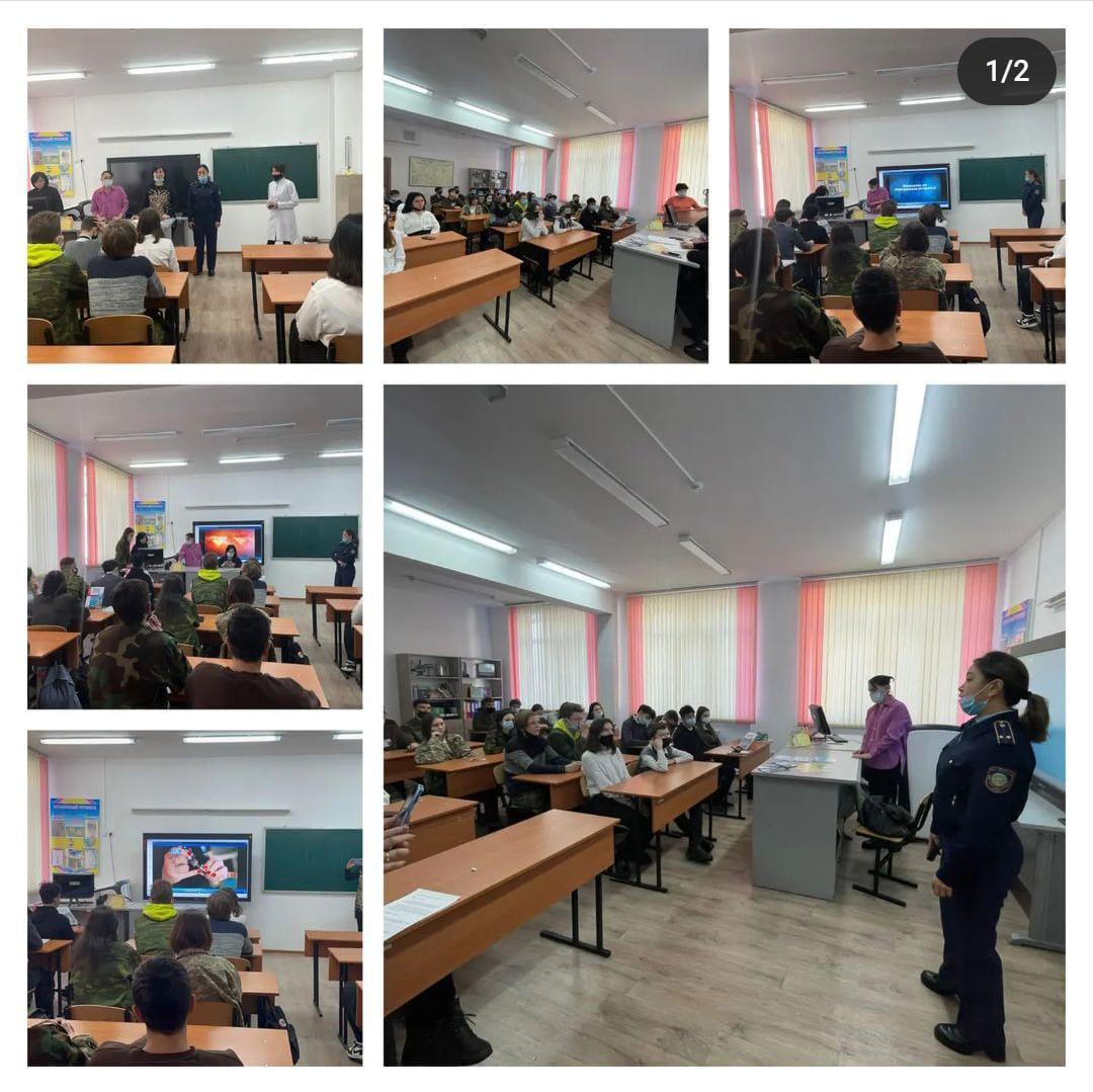2022 жылдың 17 ақпан күні Облыстық психикалық денсаулық орталығының маманы Т.И. Чевченко, мектеп инспекторы А. Болатқызы, мектеп медбикесі І. Ахтаңбай және педагог-ұйымдастырушы А. Оспанғазы 9-10 сынып оқушыларына Балалар мен жастар және ересек тұрғындар арасында психобелсенді заттарды қолданудың алдын алу (Темекі шегу, нашақорлық, маскүнемдік, энергетикалық сусындарды, шылым қоспалары мен насывай, электрондық сигареттерді қолдану, бейнероликтер көрсету (фото материалдар қоса беріледі, ТМ тарату). "Туберкулездің алдын алу", "Салауатты өмір салты " тақырыбында түсіндірме жұмыстарын жүргізді.