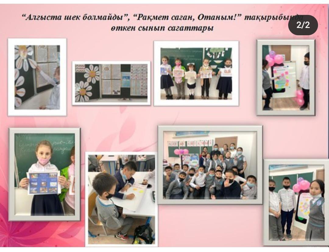 «Алғыс айту күніне» орай 5-11 сынып оқушылары арасында "Алғыста шек болмайды" және 1-4 сынып оқушылары арасында "Рақмет саған,Отаным!" атты сынып сағаттары ұйымдастырылып өтті.  Мақсаты: Рухани жаңғыру, салт-дәстүрлер, тілі мен  мәдени мұрамен байланысқан ұлттық бірегейлікті сақтауды, "Жаңғыру" құндылығы туралы түсінігін кеңейту болып табылады. Мектеп оқушылары белсенділік танытып, өз үлестерін қосып, тәрбиелік мәні бар шарамен таныстырылды