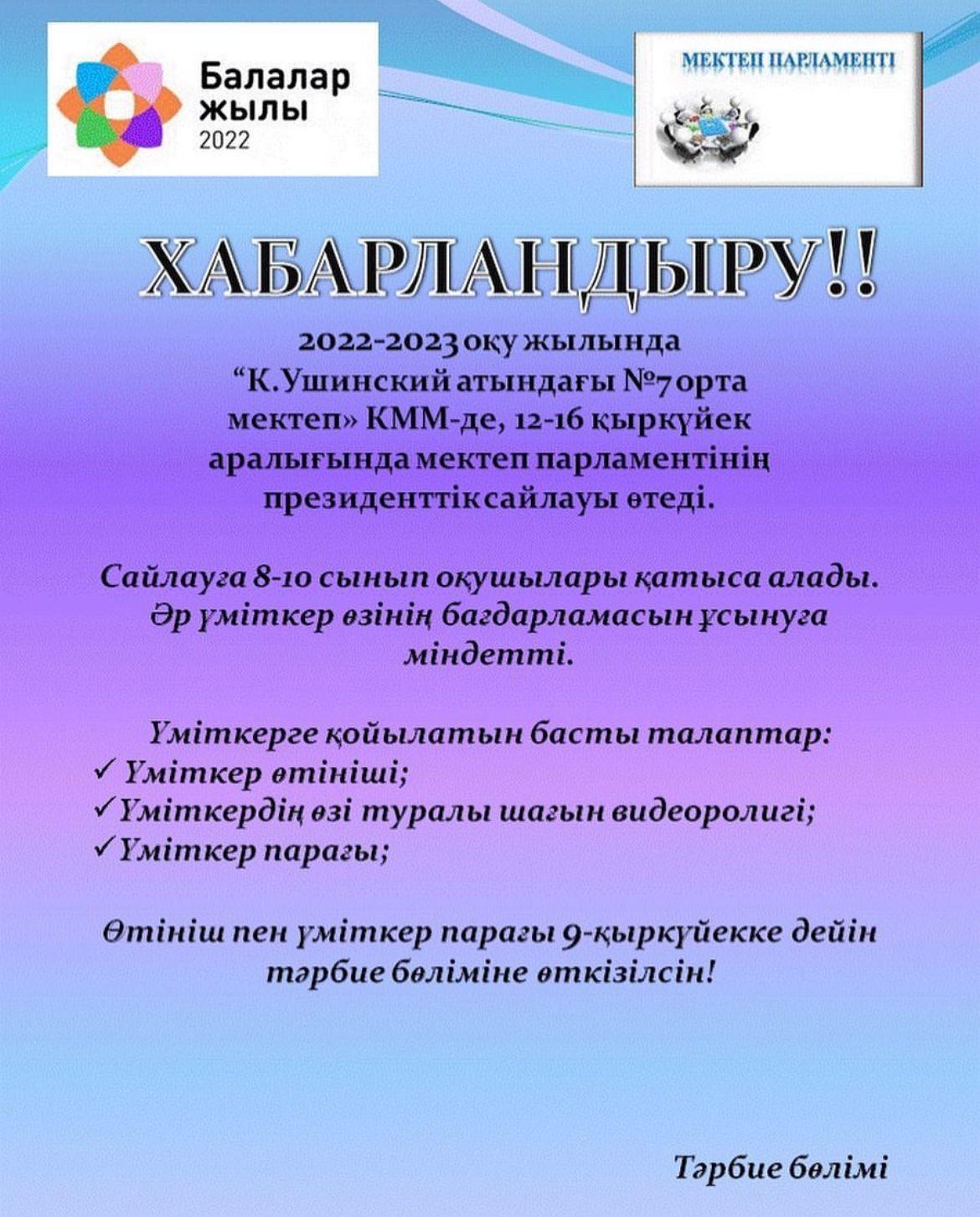 Хабарландыру!!! 2022-2023 оқу жылында “К.Ушинский атындағы №7 орта  мектеп» КММ-де, 12-16 қыркүйек аралығында мектеп парламентінің  президенттік сайлауы өтеді.