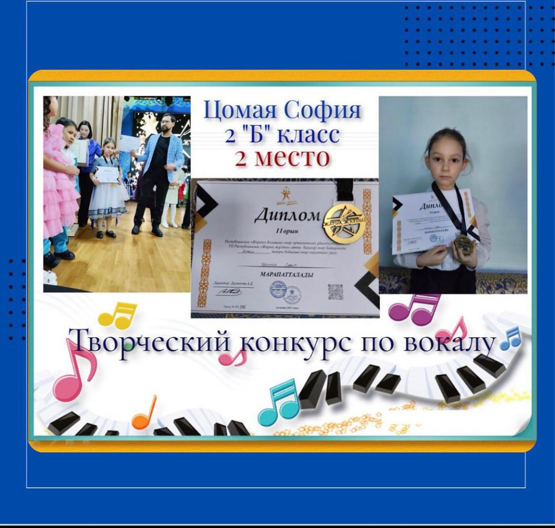 Цомая София, ученица 2 "Б" класса, участвовала в 7 Республиканском конкурсе «Жарық Жұлдыз» организованном Республиканским творческим центром «Жарқын Болашақ» и заняла 2 место