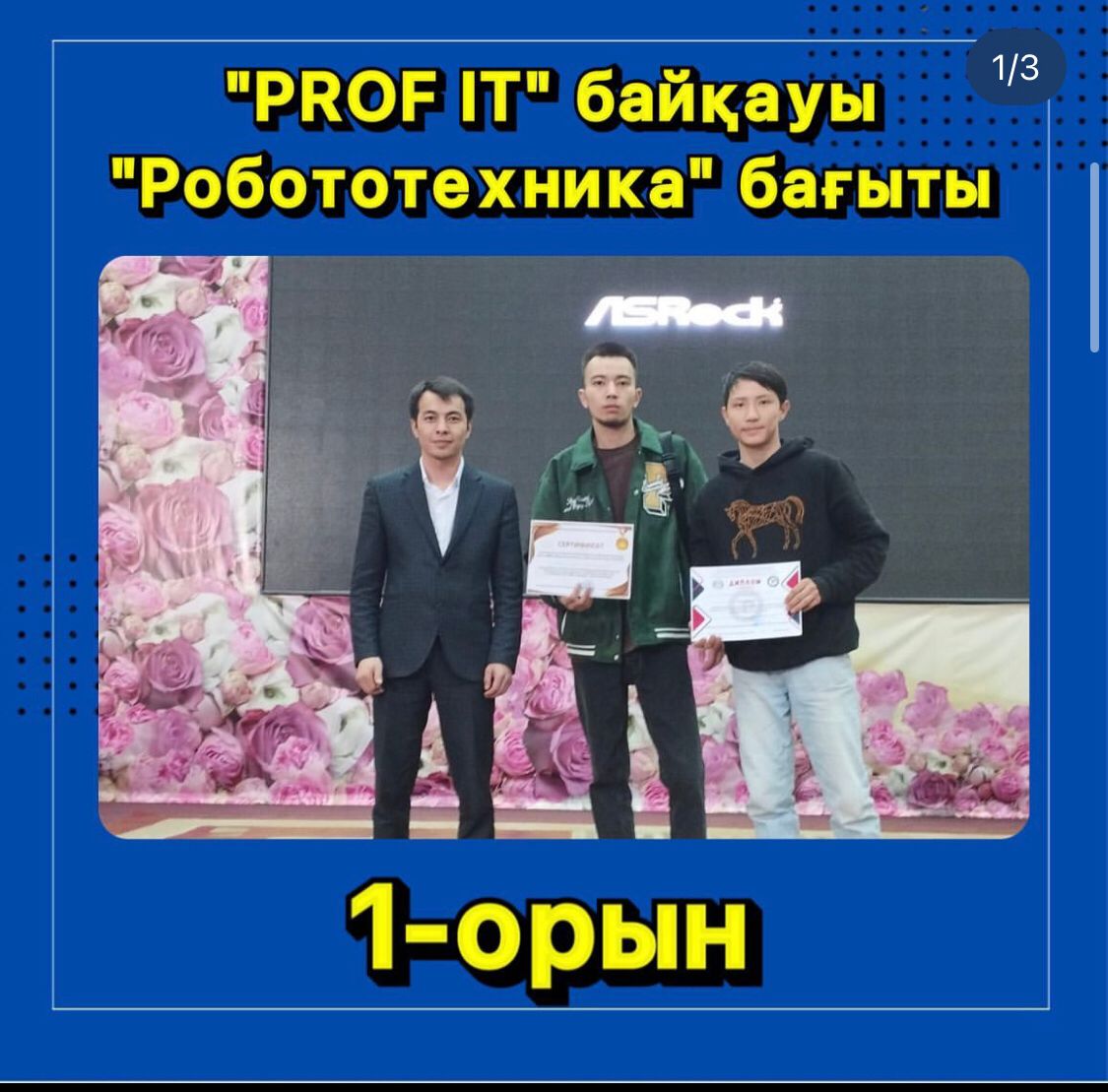 02 наурыз күні Жоғарғы политехникалық колледжі ұйымдастырған "Prof IT" байқауында Роботехникадан оқушыларымыз Дүйсебек Жәнібек және Қожақан Арлан I- дәрежелі Дипломмен марапатталды , Ілиясов Жандос және Қырғызбай Еркебұланға Алғыс хат берілді . Жетекшілері : Бекқали Ерсұлтан Арғынбайұлы мен Атымтаева Айгерім Мейрамханқызы.